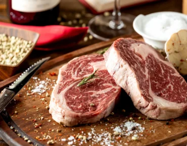 Mano con guantes sosteniendo un plato con cortes de carne roja de res, exhibiendo su veteado y frescura, en un entorno de carnicería.